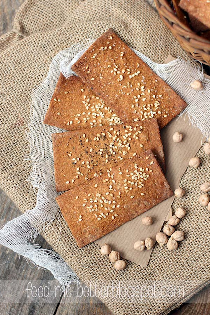 Ostatnio na moim fanpage'u na facebook'u pytałam się Was, co chcielibyście zobaczyć na blogu. W odpowiedziach pojawiły się między innymi słone przekąski, którymi można zastąpić na przykład czipsy czy paluszki. Od jakiegoś czasu miałam pomysł na dietetyczne krakersy, a to była dla mnie dodatkowa motywacja. Dlatego dziś prezentuję Wam uzdrowione i odchudzone krakersy z ciecierzycy. Nie wiem, czy w sklepach dostępna jest mąka z ciecierzycy - ja po prostu zmieliłam w młynku suchą ciecierzycę. Ważne jednak, aby zrobić to bardzo dokładnie. Jeśli chodzi o przyprawy, to można z nimi śmiało eksperymentować i używać tych, które lubimy najbardziej. Krakersy są bardzo smaczne, mocno chrupiące, idealne zarówno jako samodzielna przekąska, jak i na przykład z serkiem czy pastą kanapkową.